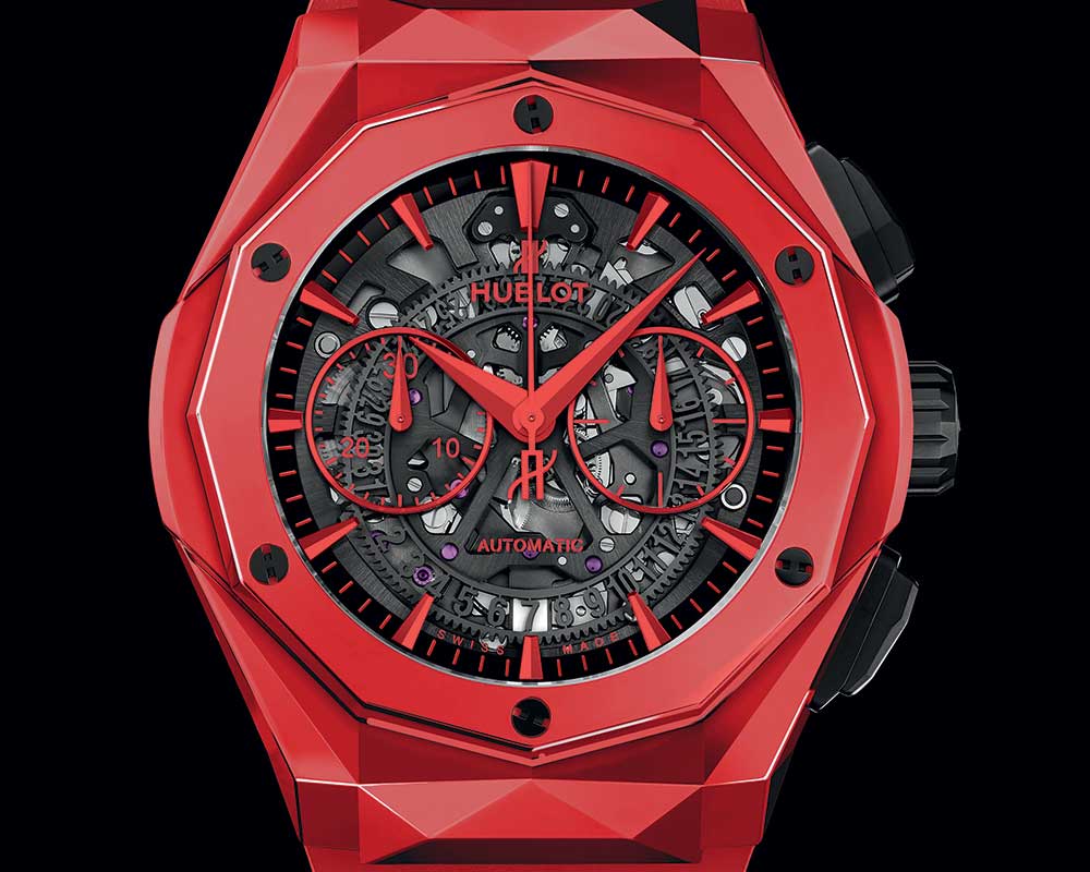 В концепции Red Magic используется ярко-красный цвет, представленный в знаменитой Crocodile Born Wild, первой скульптуре французского художника, датируемой 2004 годом. Этот динамический цвет используется на керамическом футляре нового часы, настоящее техническое достижение Hublot, учитывая проблему окрашивания керамических материалов. Корпус часов шириной 45 мм и толщиной 13,45 мм украшен знаменитыми складками, которые являются одной из художественных торговых марок Орлинского.